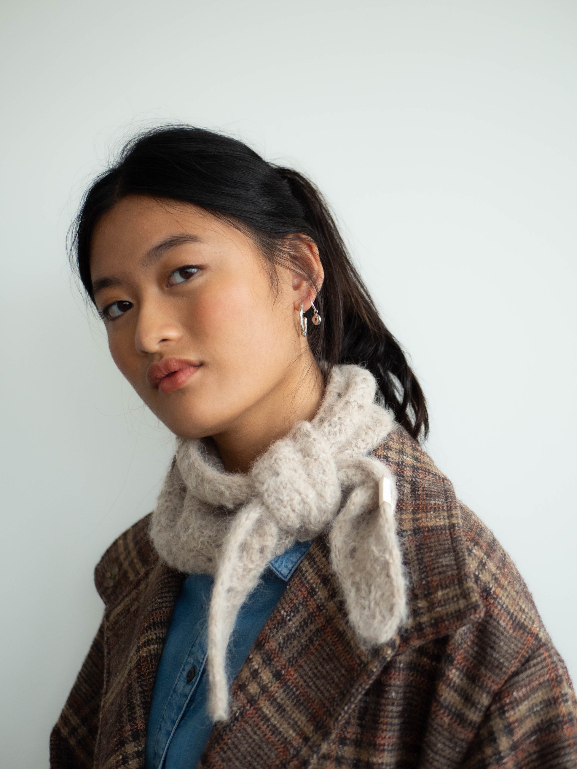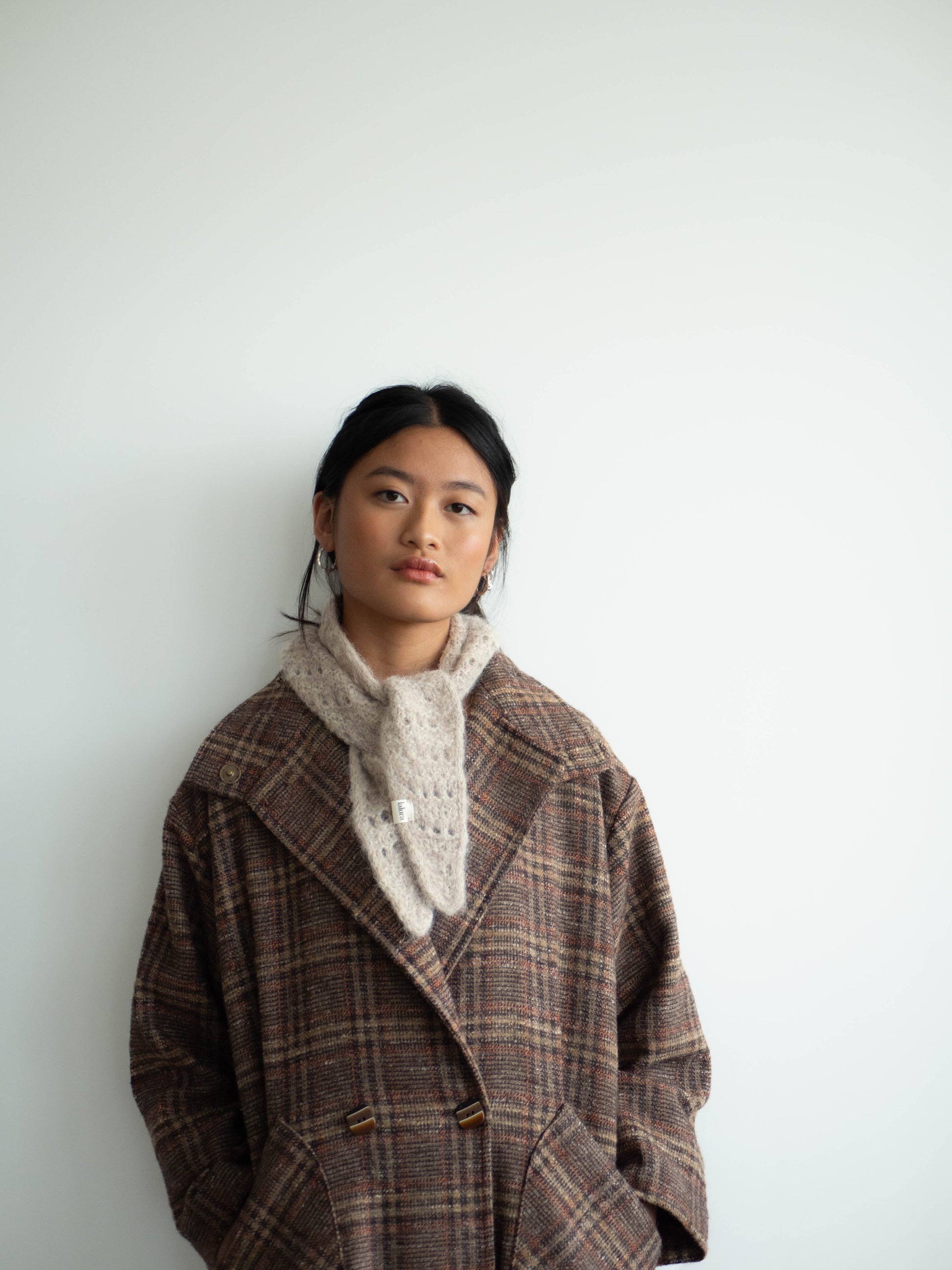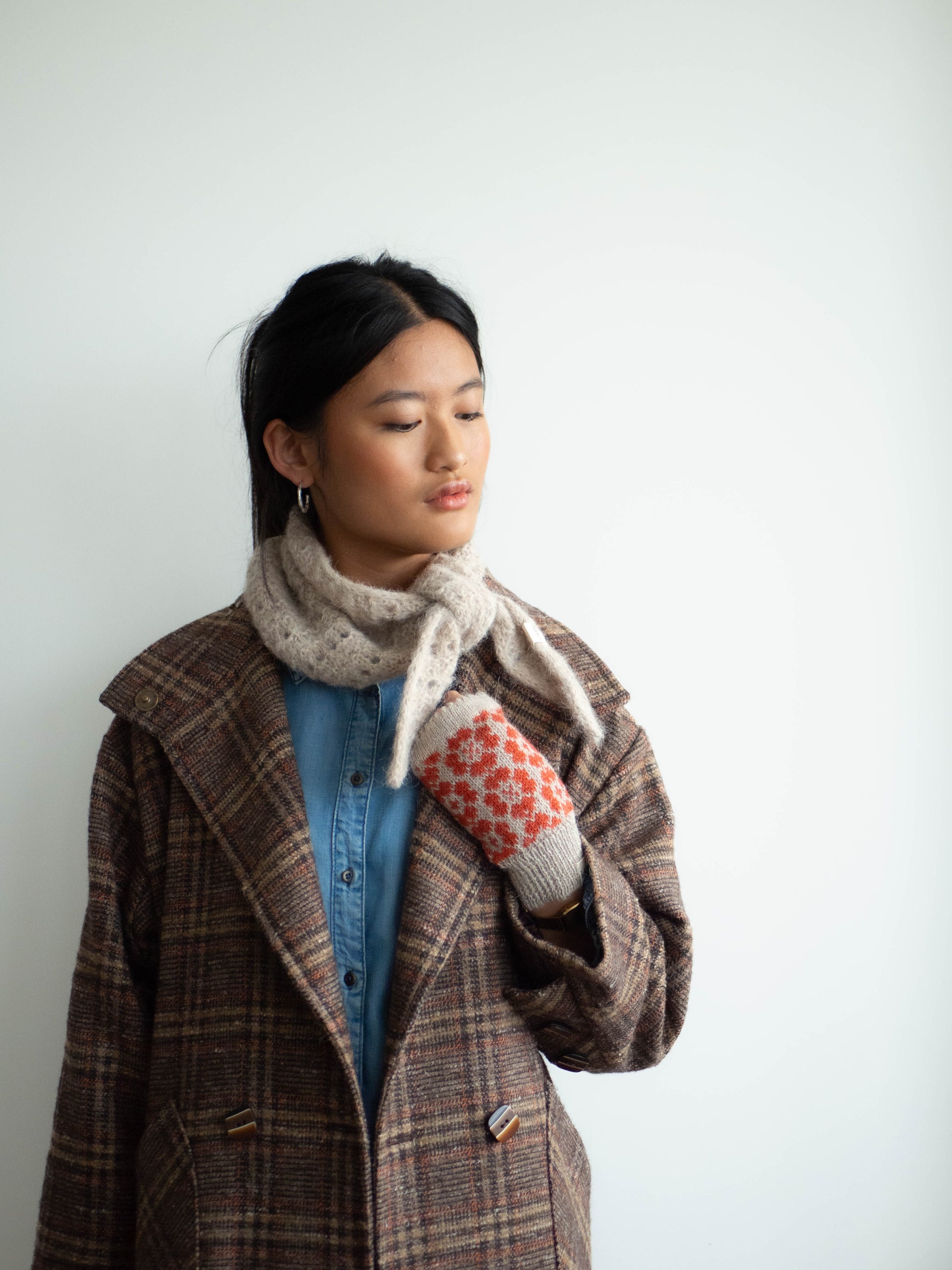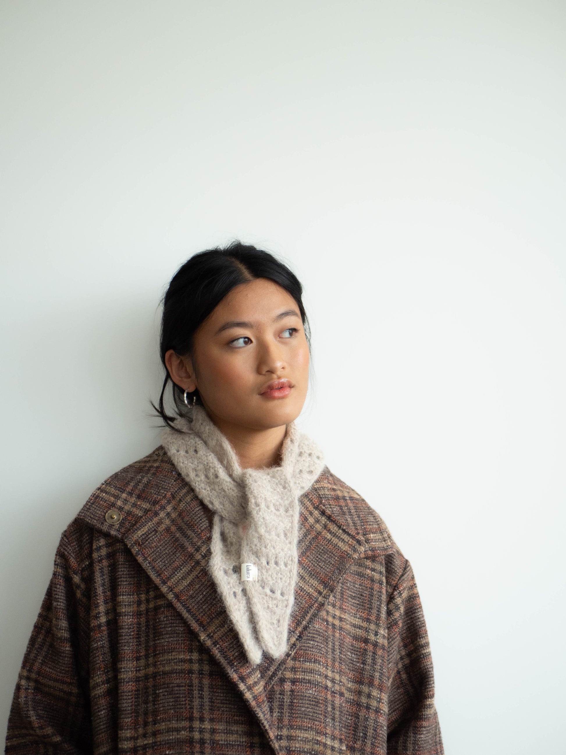 Esta pañoleta se teje de lado a lado empezando por un extremo con un i-cord y 3 puntos, crece hacia el centro inferior y después decrece hasta cerrar el i-cord con 3 puntos.
