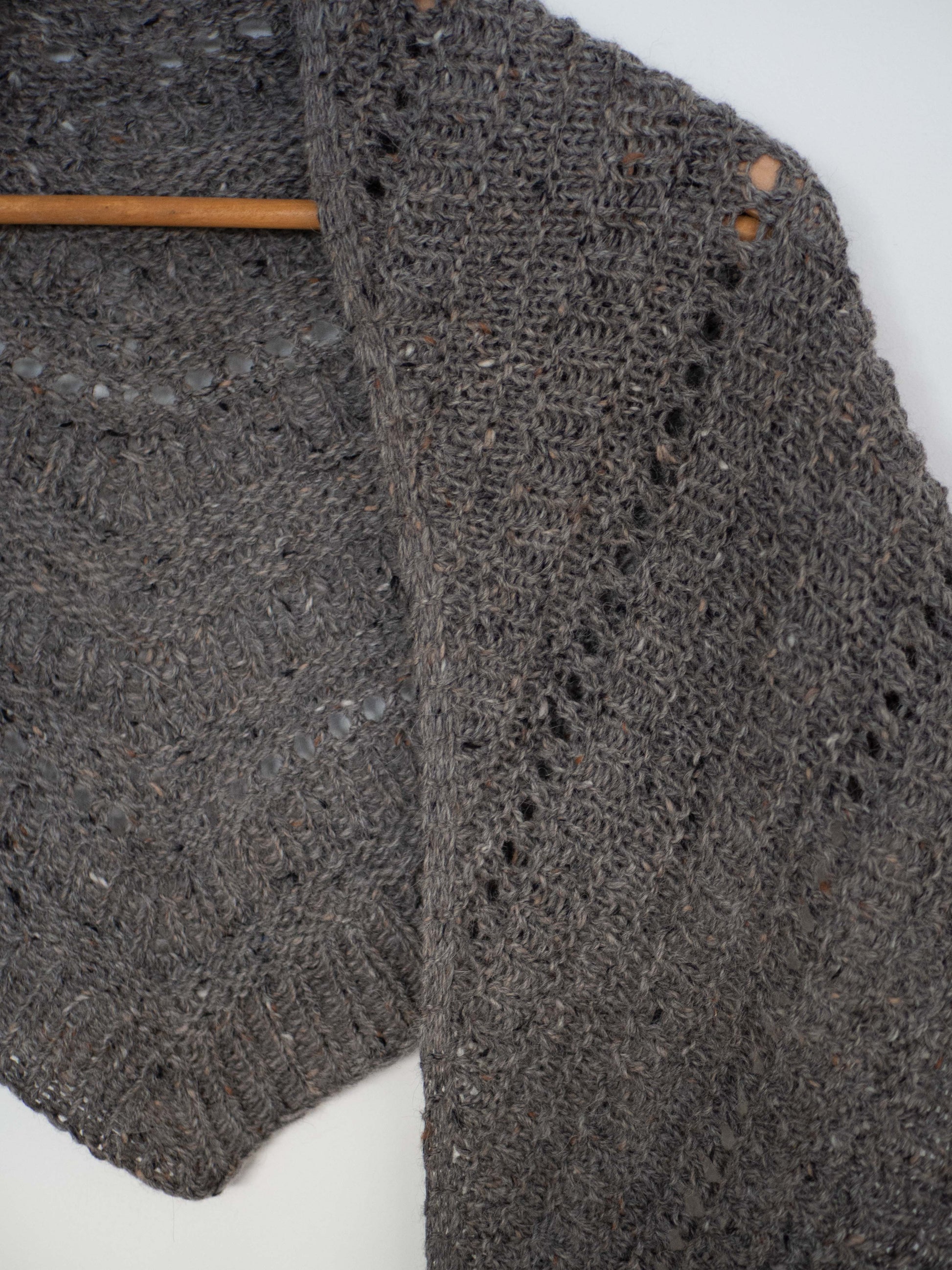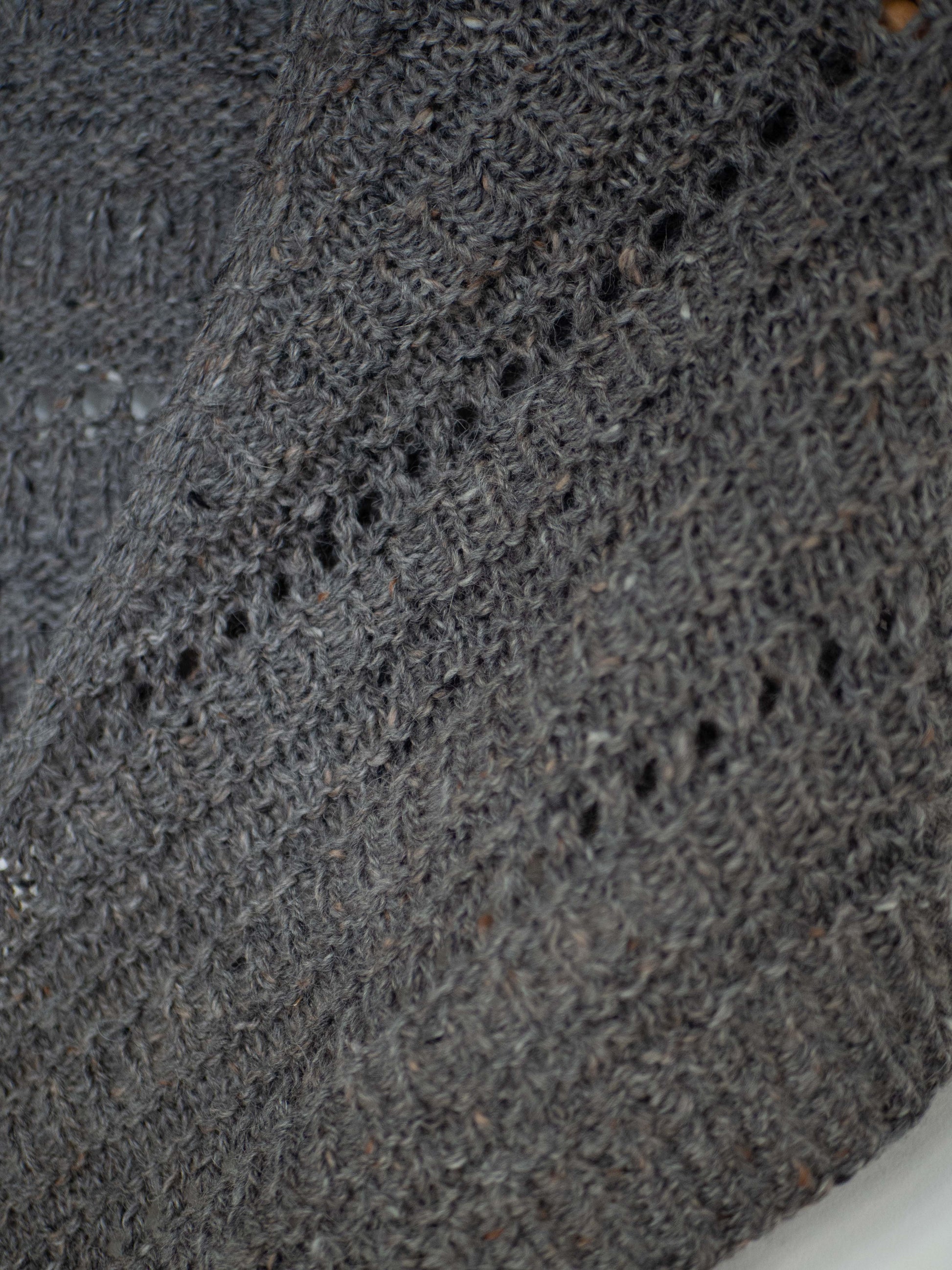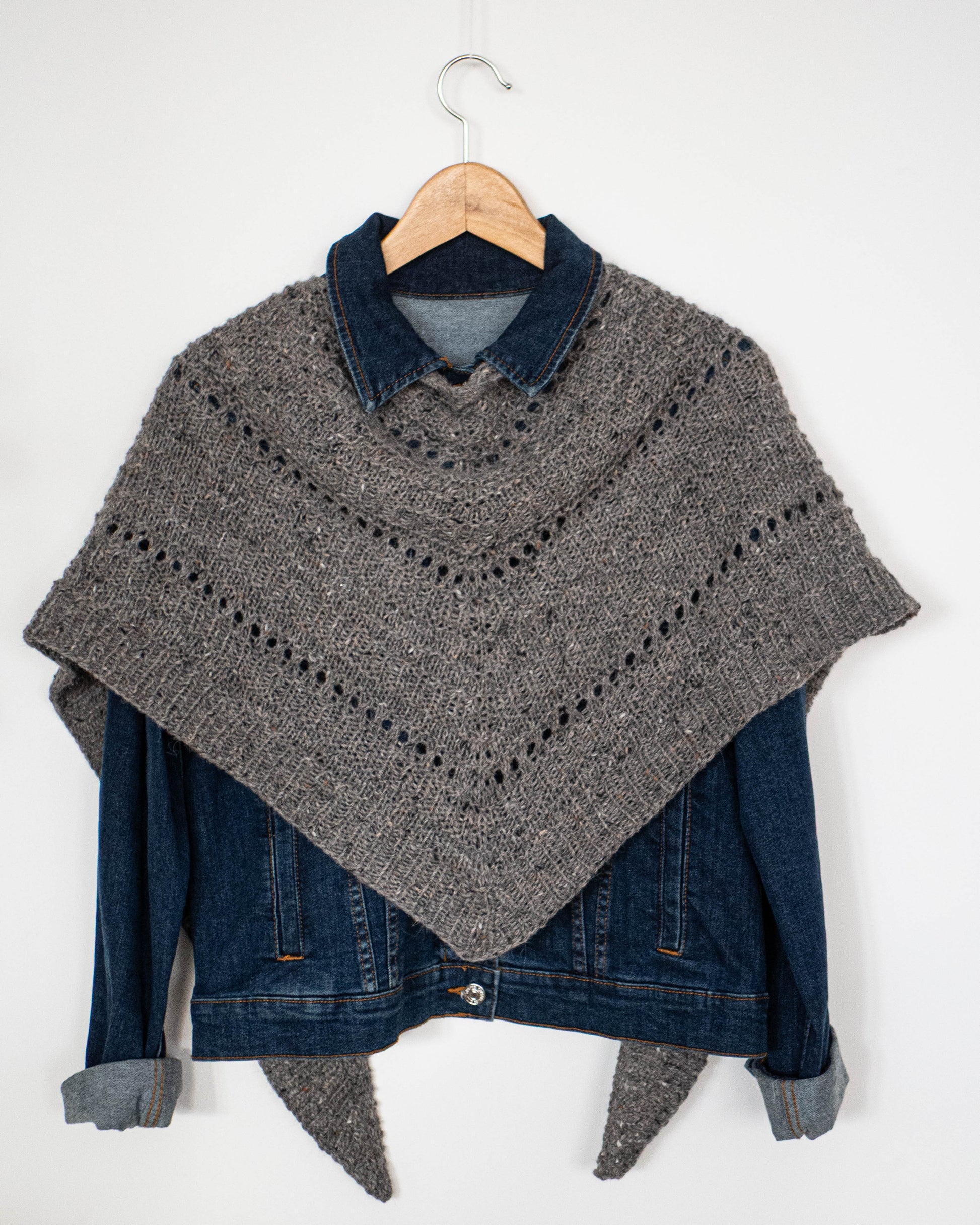 Este chal se teje de arriba a abajo empezando con un montaje en punto del derecho, del que se remontan los puntos y se teje todo el cuerpo del chal, creciendo hacia los laterales y hacia abajo, su forma final es triangular. Al final, se tejen unas vueltas de punto elástico y se cierra el chal.