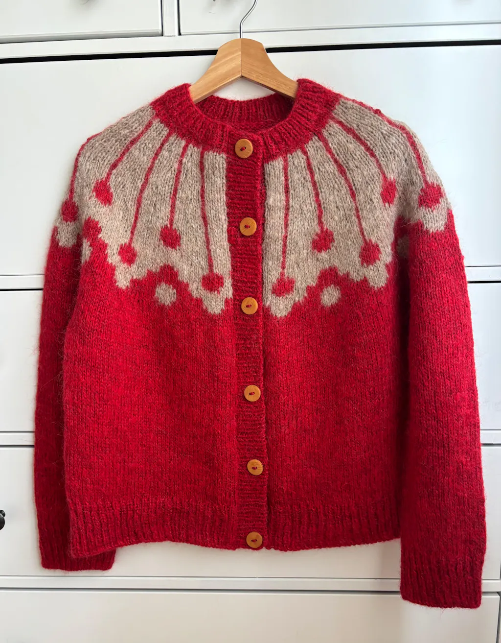 Esta chaqueta tiene una construcción top-down en circular, se teje primero como si fuese un jersey, es decir, se empieza tejiendo por el escote, se continúa por el canesú, luego se separan las mangas y cuerpo, y se continúa tejiendo el cuerpo en circular. A continuación, se retoman las mangas y se tejen en circular hasta el puño. Se realiza de una sola pieza, sin ninguna costura. Se teje en punto jersey en circular, con un motivo de colourwork en el canesú. El cuerpo y las mangas acaban con un remate en punto elástico. Al acabar, se refuerzan los puntos laterales al steek mediante ganchillo, se tejen las tapetas a dos agujas y, finalmente, se corta la chaqueta de arriba abajo por el punto central del delantero, para que quede abierta.