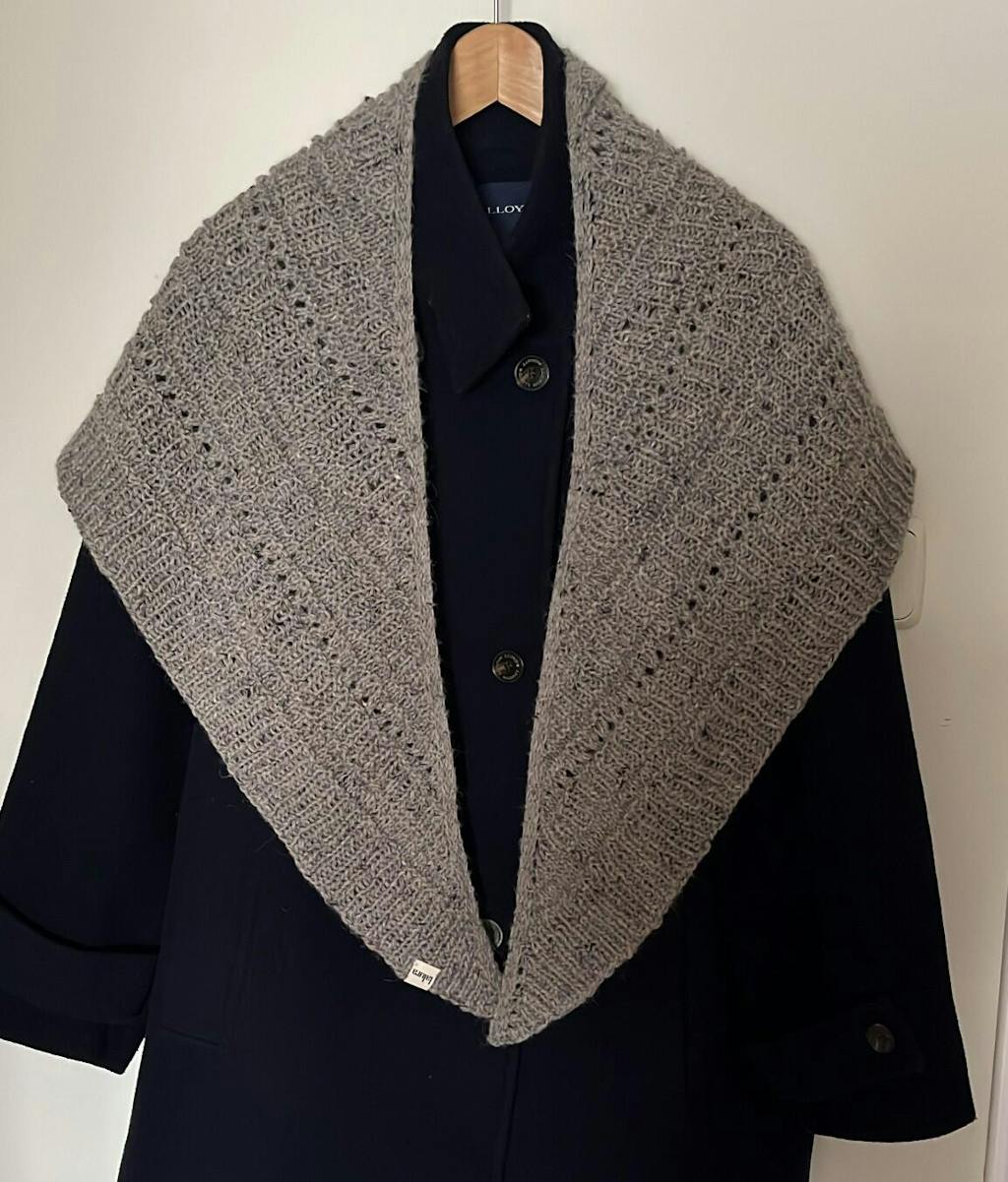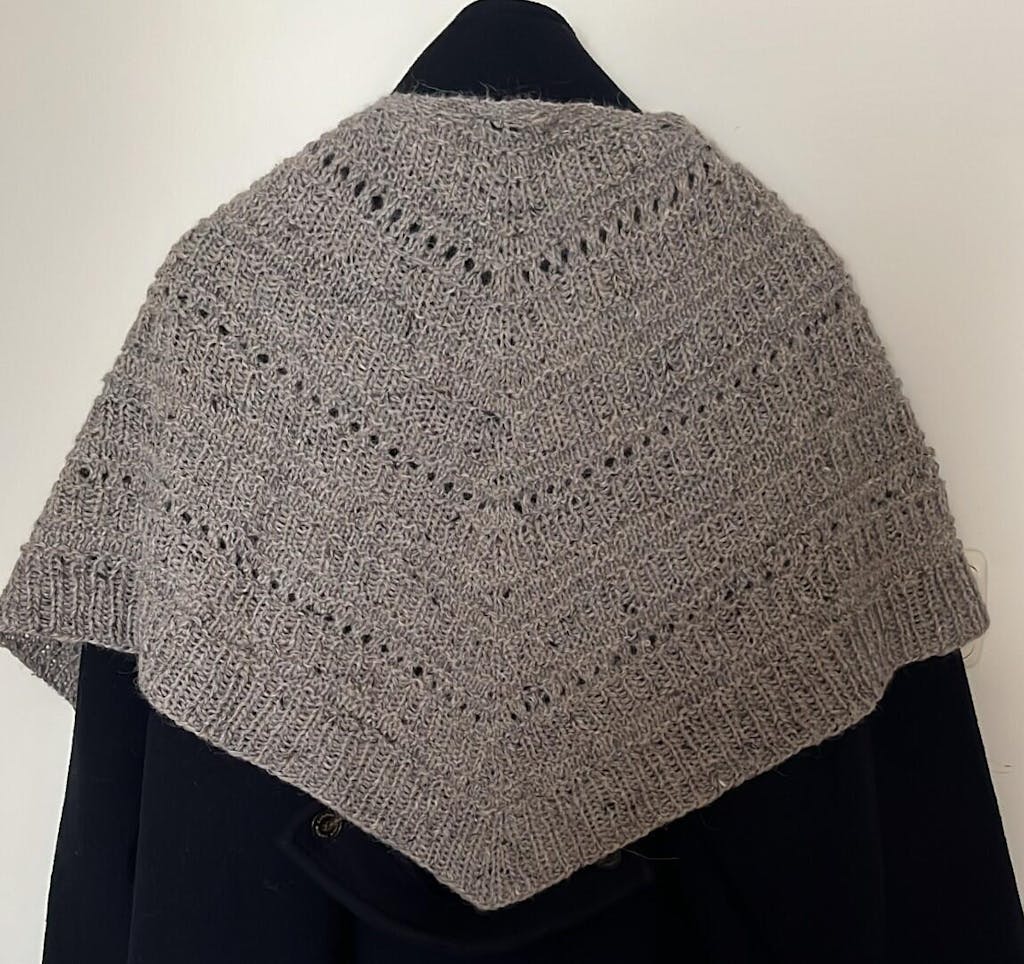 Este chal se teje de arriba a abajo empezando con un montaje en punto del derecho, del que se remontan los puntos y se teje todo el cuerpo del chal, creciendo hacia los laterales y hacia abajo, su forma final es triangular. Al final, se tejen unas vueltas de punto elástico y se cierra el chal.