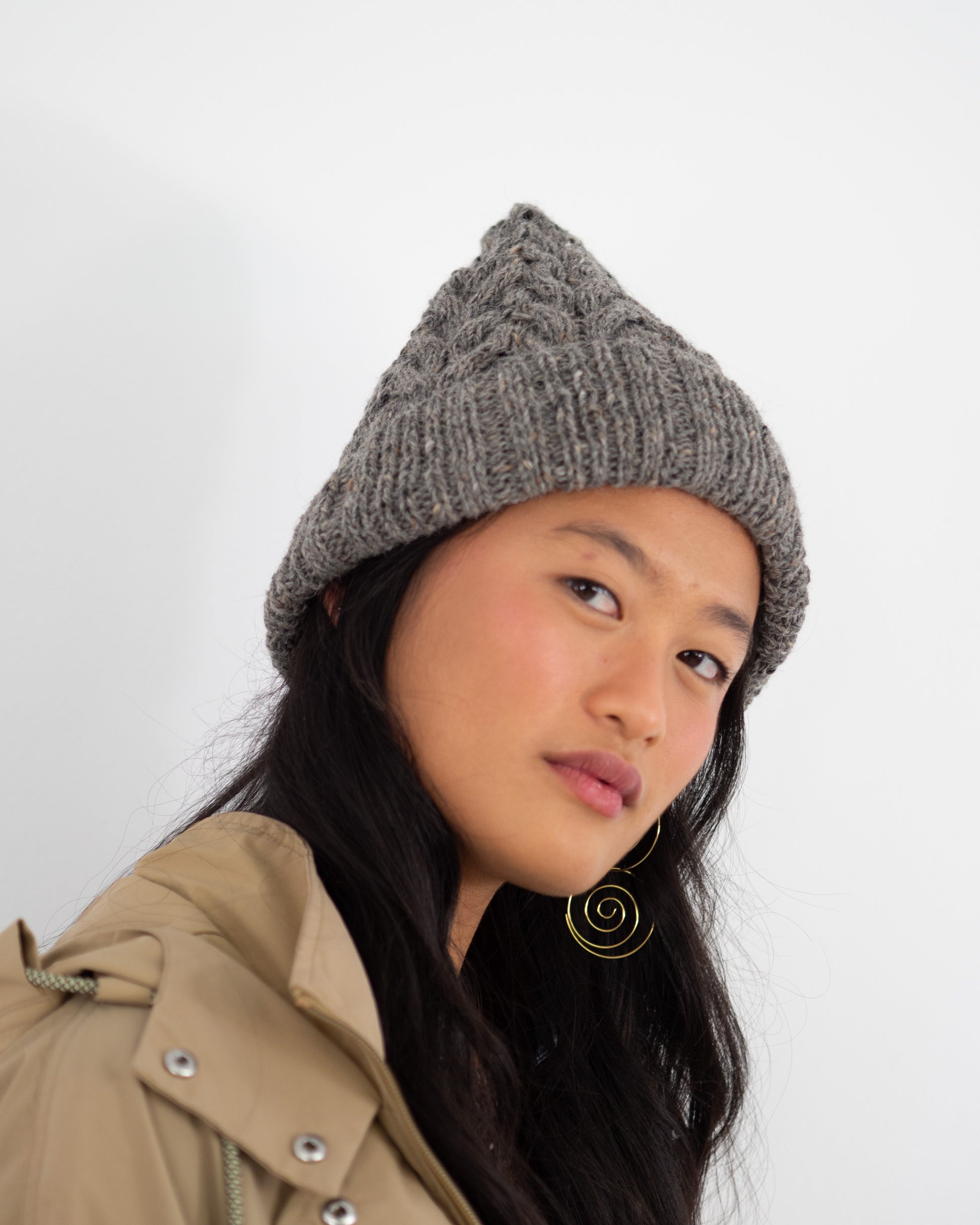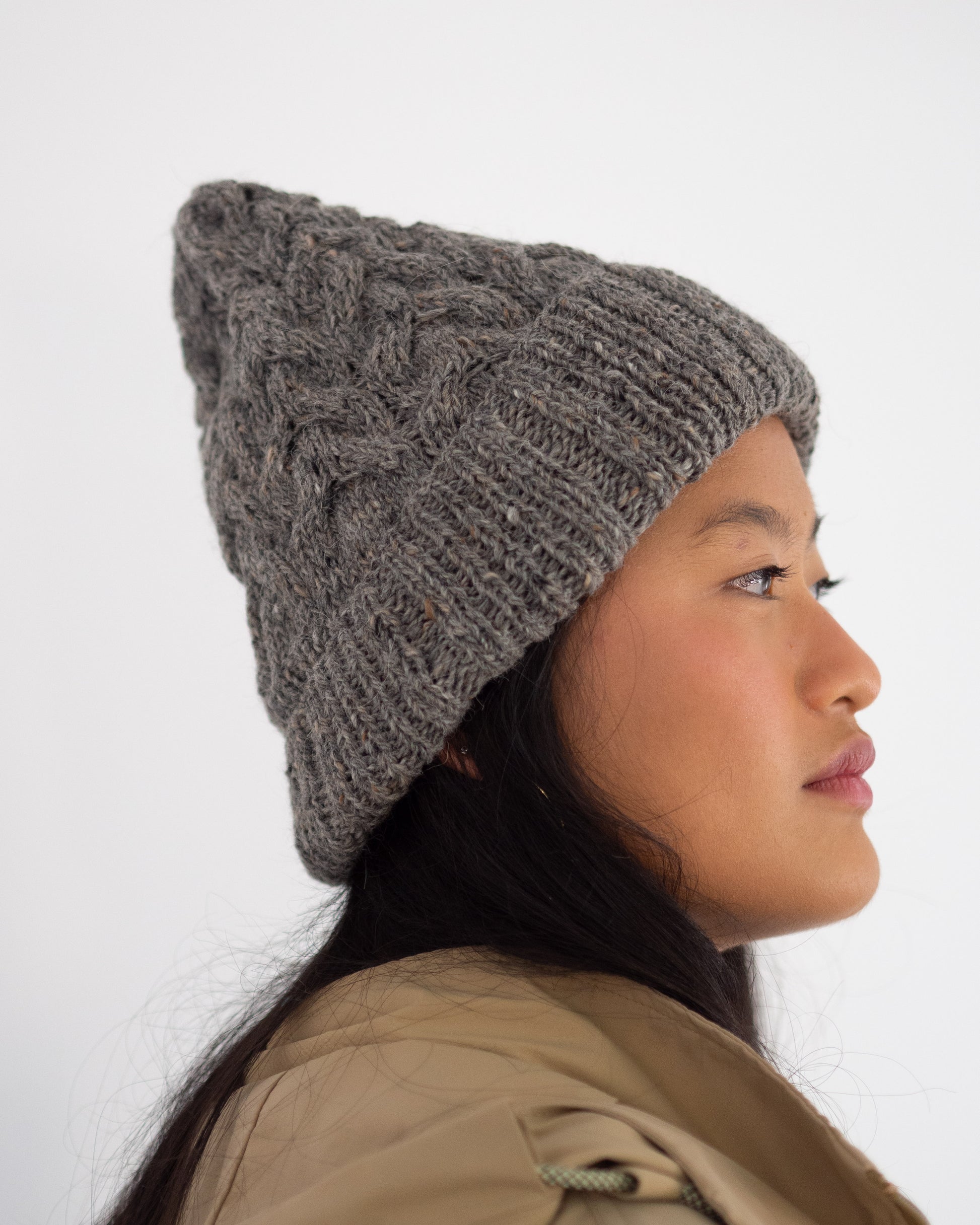 Agujas circulares de 3.5 mm [US 4] para el montaje y el elástico, agujas circulares de 4 mm [US 6] para el cuerpo del gorro si son necesarias para obtener la tensión.