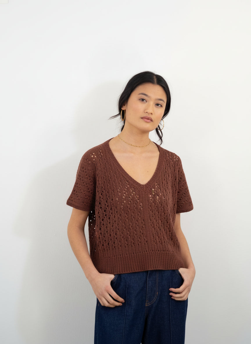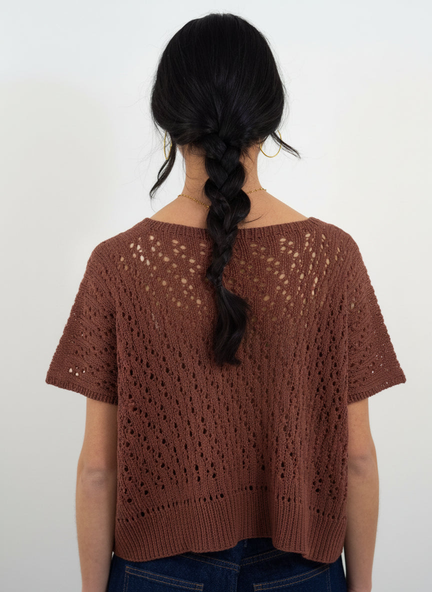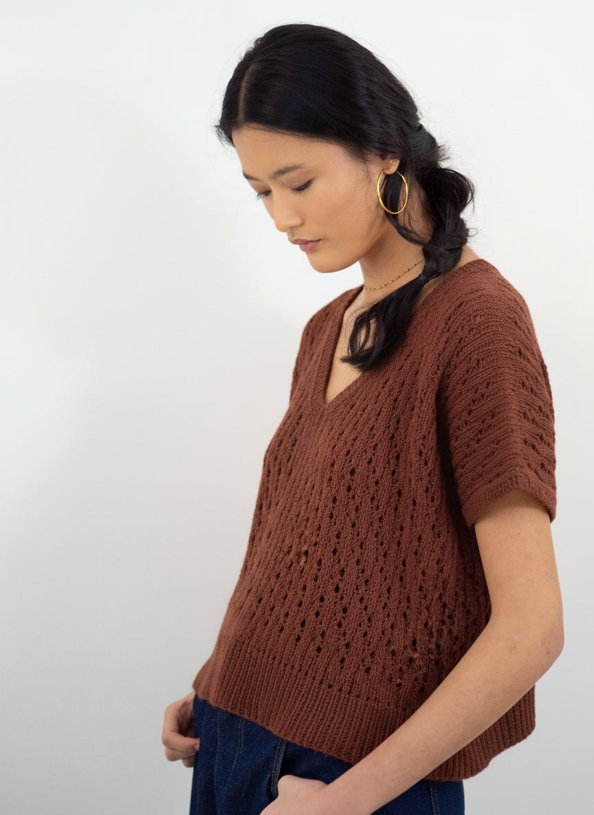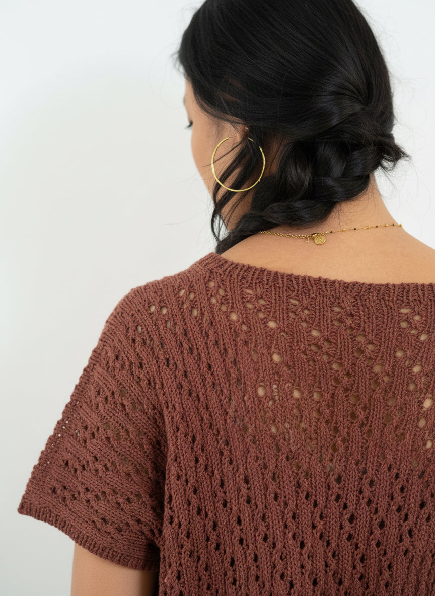Este es un top/chaleco bottom-up, es decir, se teje de abajo hacia arriba. Primero se teje el elástico, luego el cuerpo que se teje en circular hasta las sisas donde se separan delantero y trasero, que se tejen en plano hasta los hombros, que se cierran con el método del remallado. Se realiza un pequeño remate en los puntos que quedan para el escote y finalmente se levantan los puntos y se tejen en punto elástico para rematar las sisas.