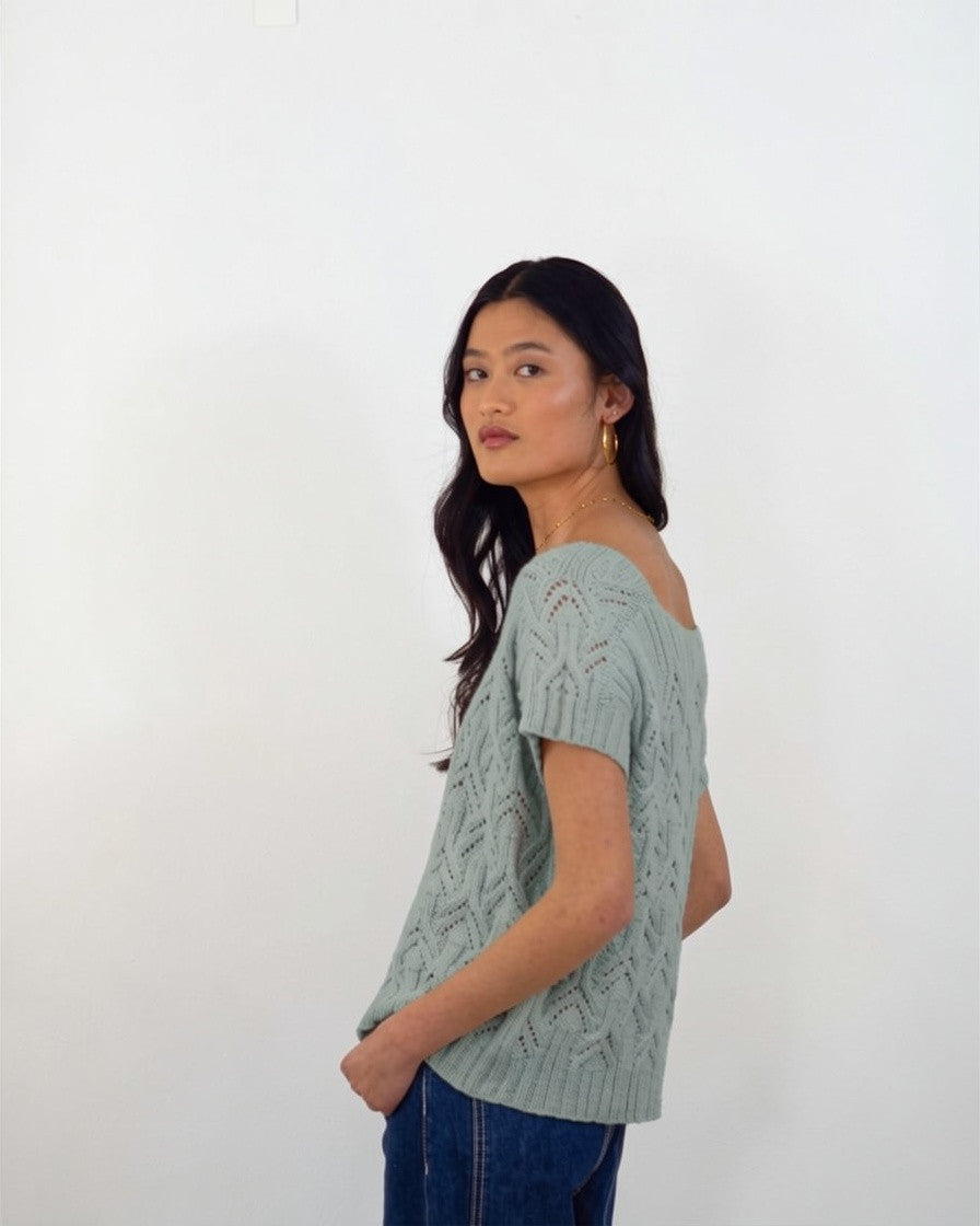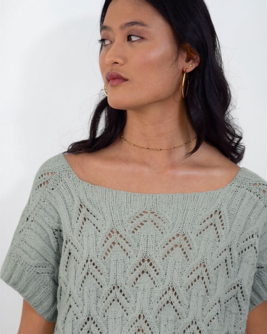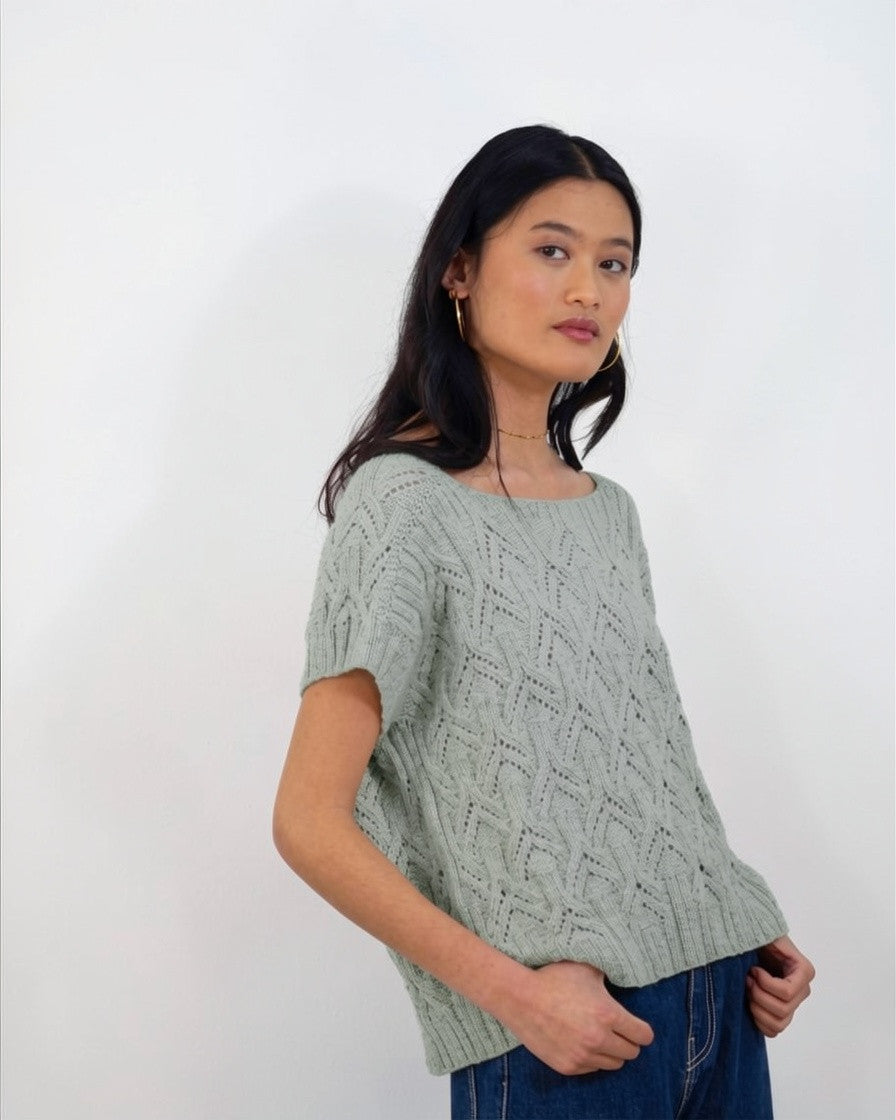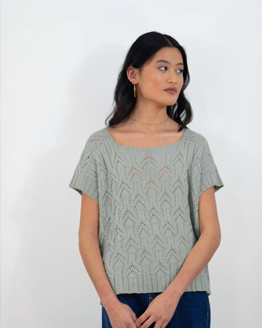 Este top se teje de una sola pieza empezando por los hombros, de los que luego se levantarán los puntos para continuar con el resto del cuerpo. El cuerpo se teje en plano tanto en el delantero como en el trasero hasta debajo de las sisas, donde el delantero y trasero se unen para continuar tejiendo en circular. Las mangas se tejen en circular.