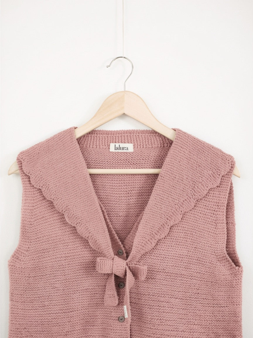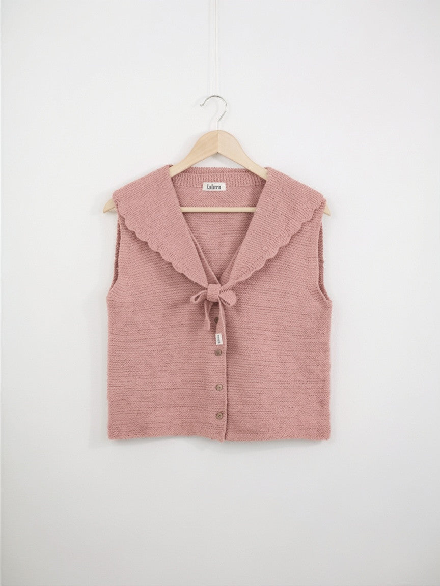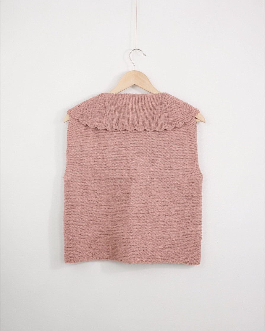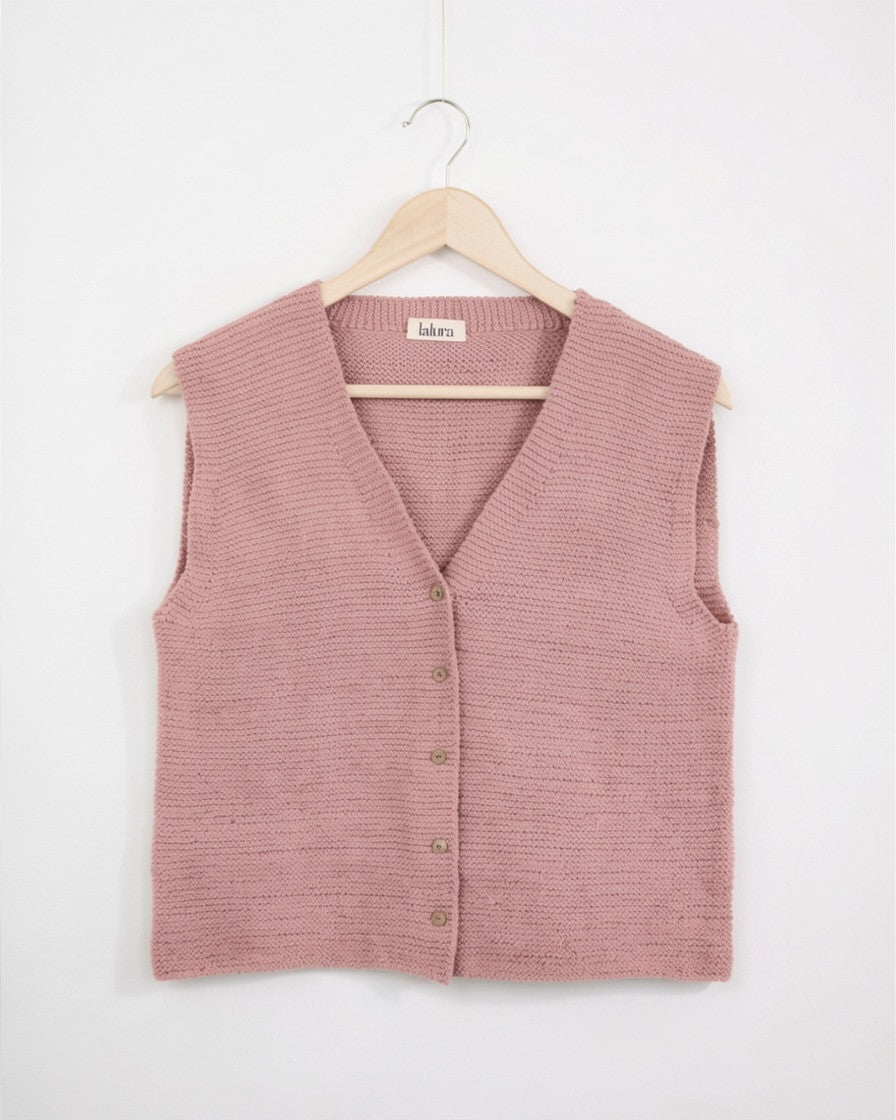 Este chaleco se construye de arriba a abajo sin ninguna costura. Se comienza tejiendo por el cuello con un montaje provisional, se continúa con el trasero (la espalda), dejando los puntos en espera cuando alcanzamos una longitud suficiente para las sisas, a continuación se retoma el montaje provisional para tejer la parte del cuello de la tapeta de botones, para después levantar puntos en los hombros, retomar estos puntos y tejer los delanteros, por separado, pero pueden hacerse simultáneamente, dependerá de la tejedora. Una vez alcanzada la longitud necesaria hasta las sisas, se unen las 2 piezas del delantero y el trasero, y se continúa tejiendo el chaleco hasta en borde inferior.