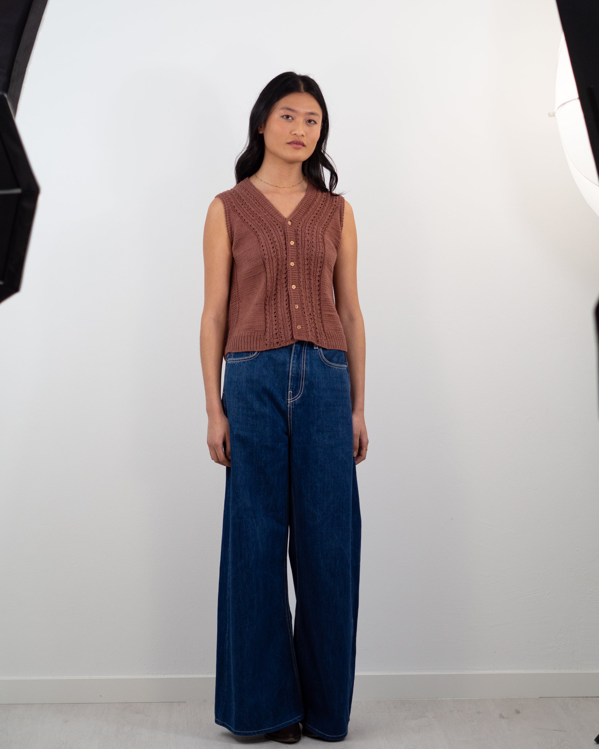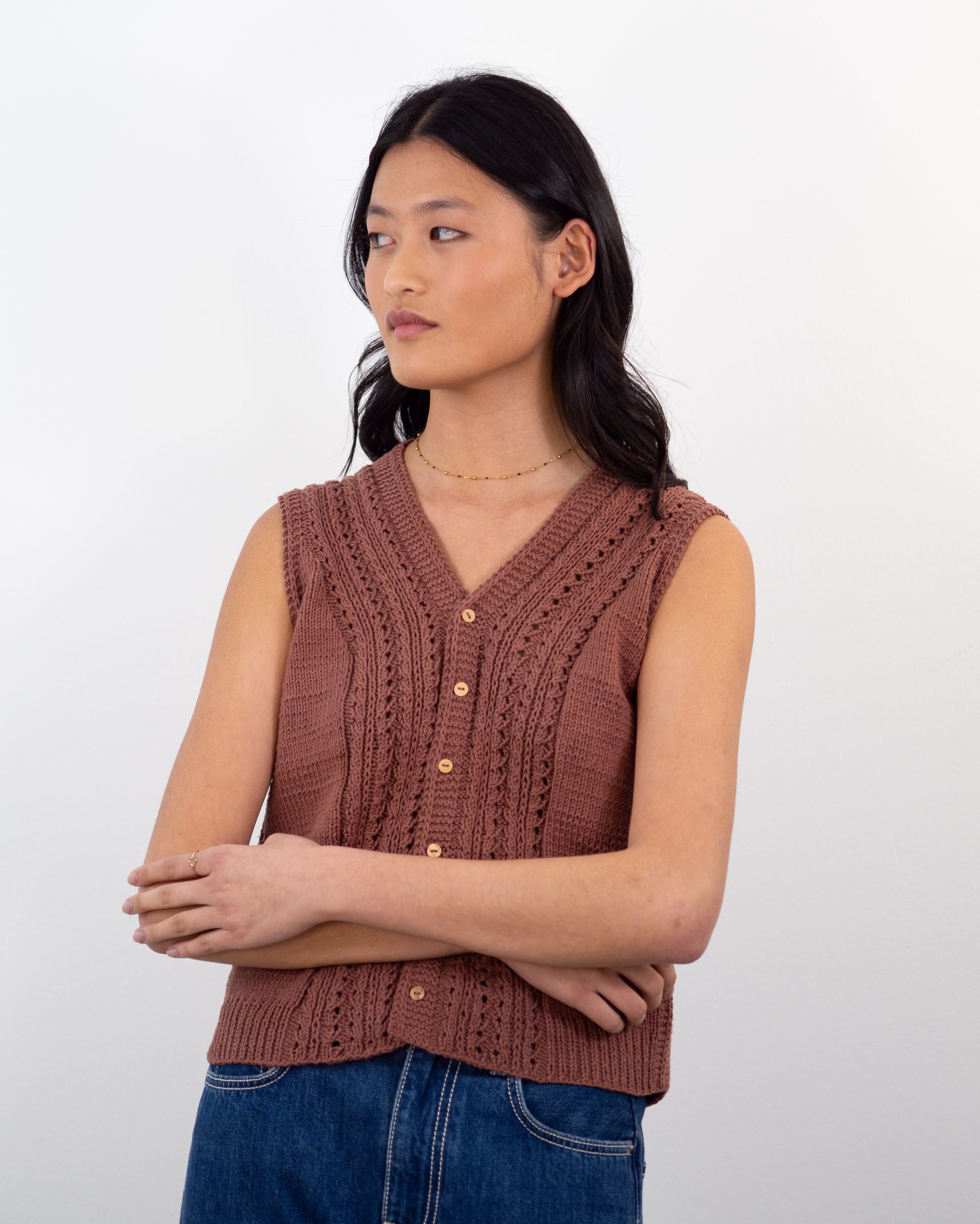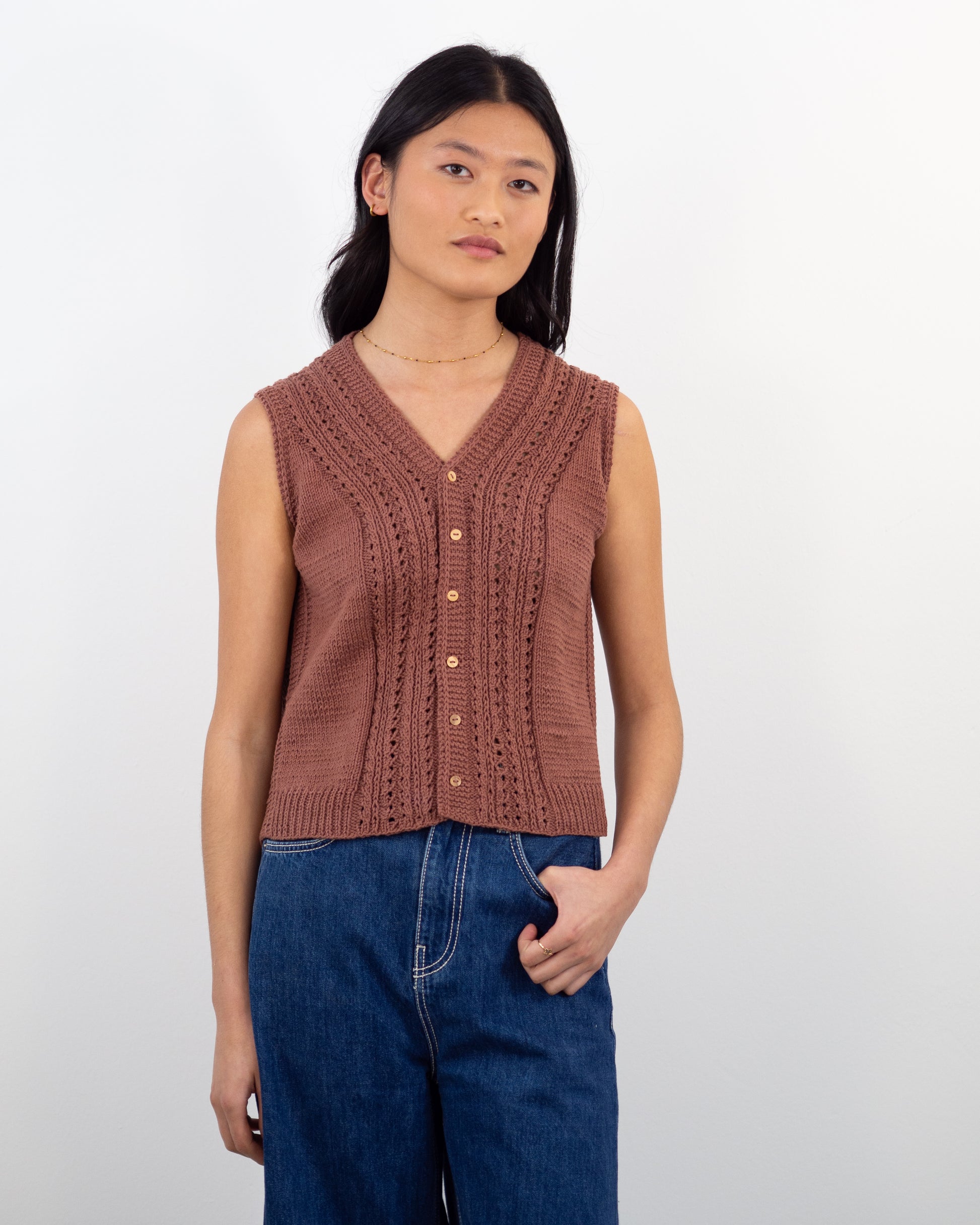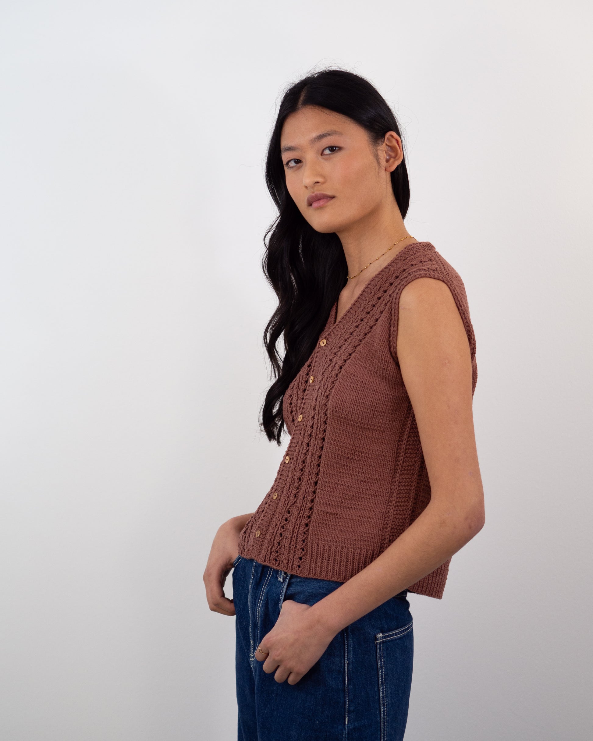 Este chaleco se construye de arriba a abajo sin ninguna costura. Se comienza tejiendo por el cuello con un montaje provisional, se continúa con el trasero (la espalda), dejando los puntos en espera cuando se alcanza la longitud suficiente para las sisas, a continuación se retoma el montaje provisional para tejer la parte del cuello de la tapeta de botones, para después levantar puntos en los hombros, retomar estos puntos y tejer los delanteros, por separado, pero pueden hacerse simultáneamente, dependerá de la tejedora. Una vez alcanzada la longitud necesaria hasta las sisas, se unen las 2 piezas del delantero y el trasero, y se continúa tejiendo el chaleco en plano hasta en elástico inferior.