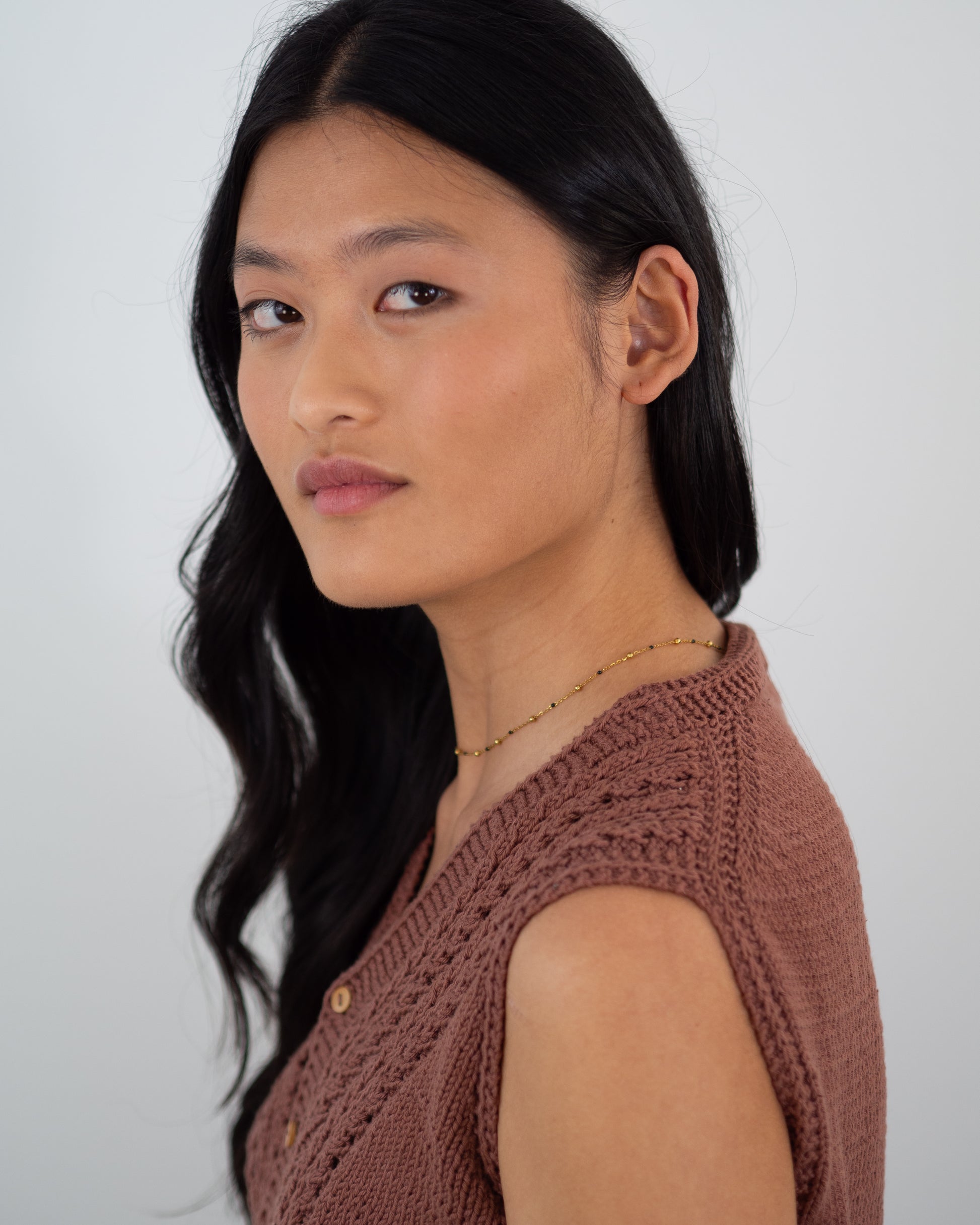 Agujas circulares de 3.25 mm [US 3] con cable de 40 cm [16"] para las sisas y más largo para el cuerpo, o las necesarias para obtener la muestra de tensión (sin bloquear). Agujas de doble punta para tejer la tira de la botonadura en el cuello (aunque se pueden usar circulares, es más cómodo con las agujas de doble punta).
