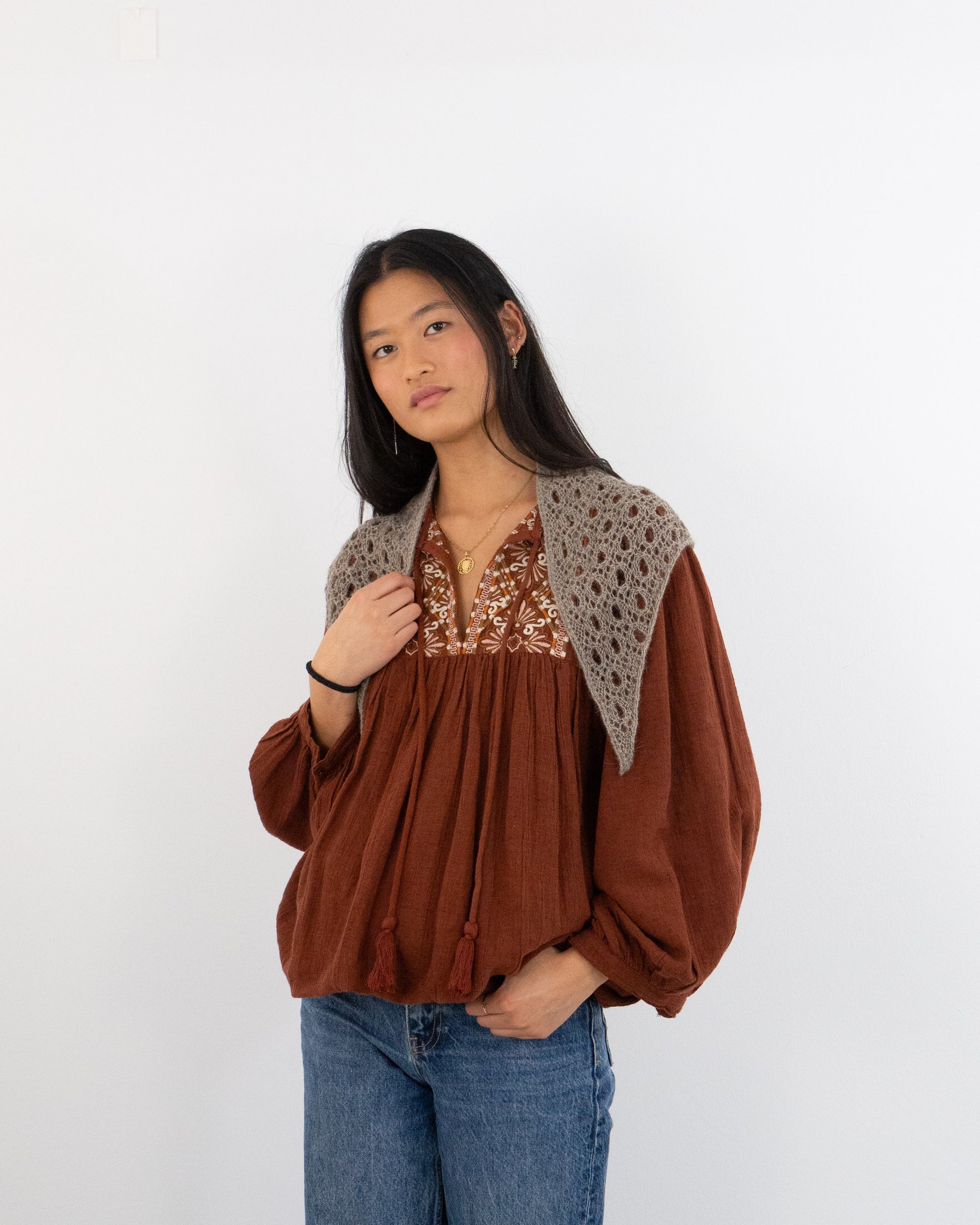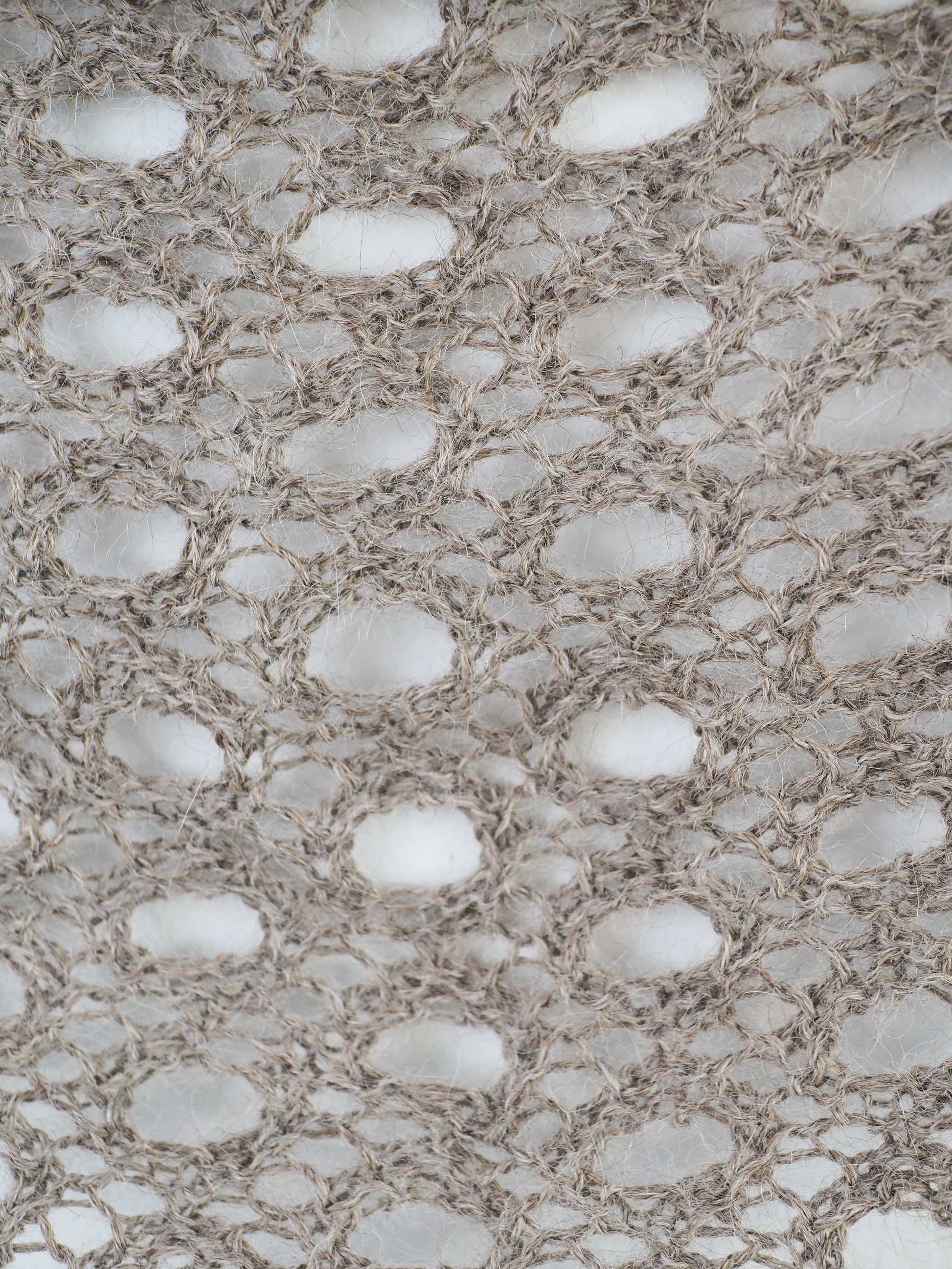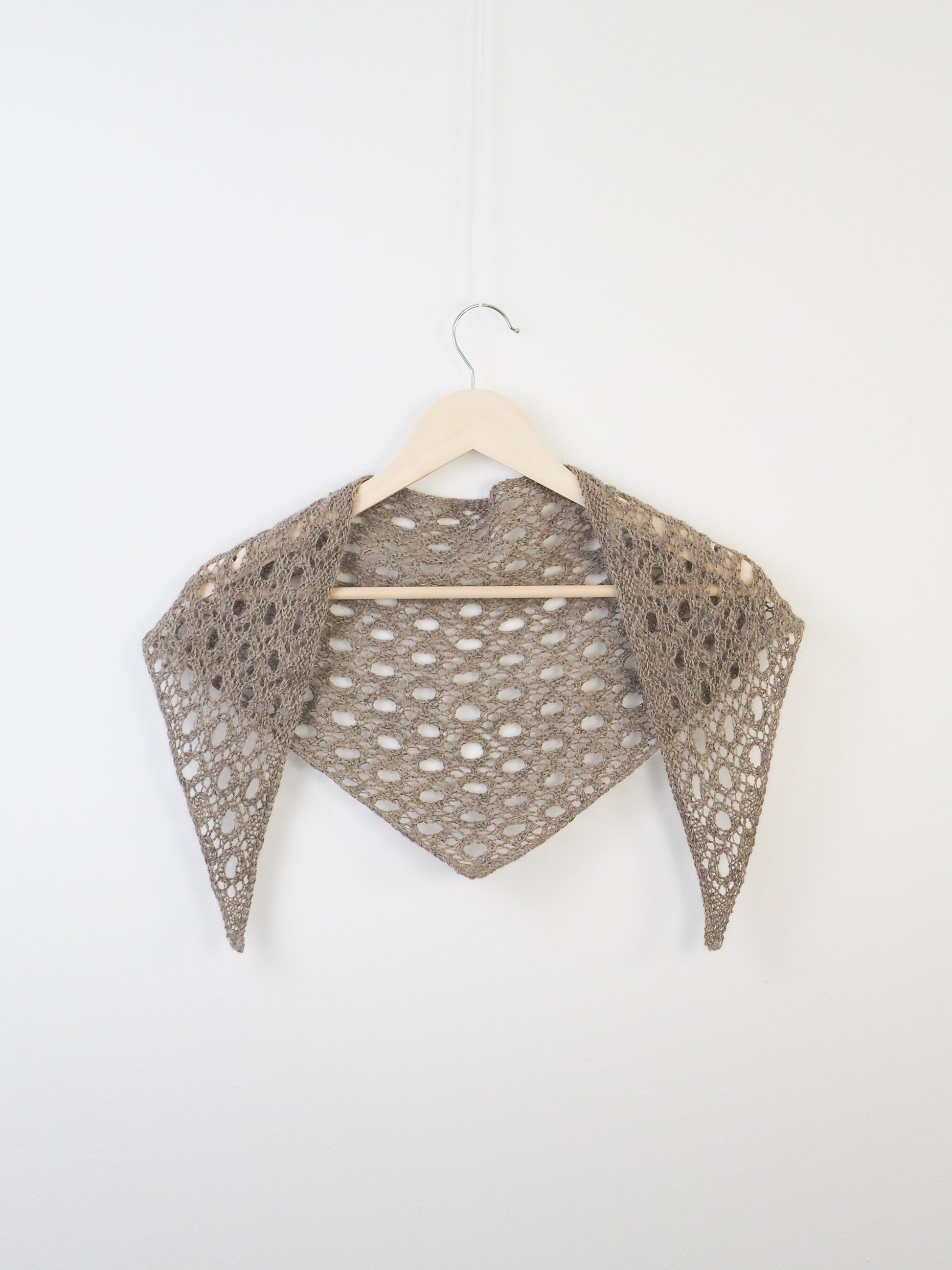 Esta pañoleta se teje de abajo a arriba, una vez alcanzado el tamaño deseado se cierran los puntos de la parte superior de la pañoleta perpendicularmente haciendo reducciones hasta que no quede ningún punto