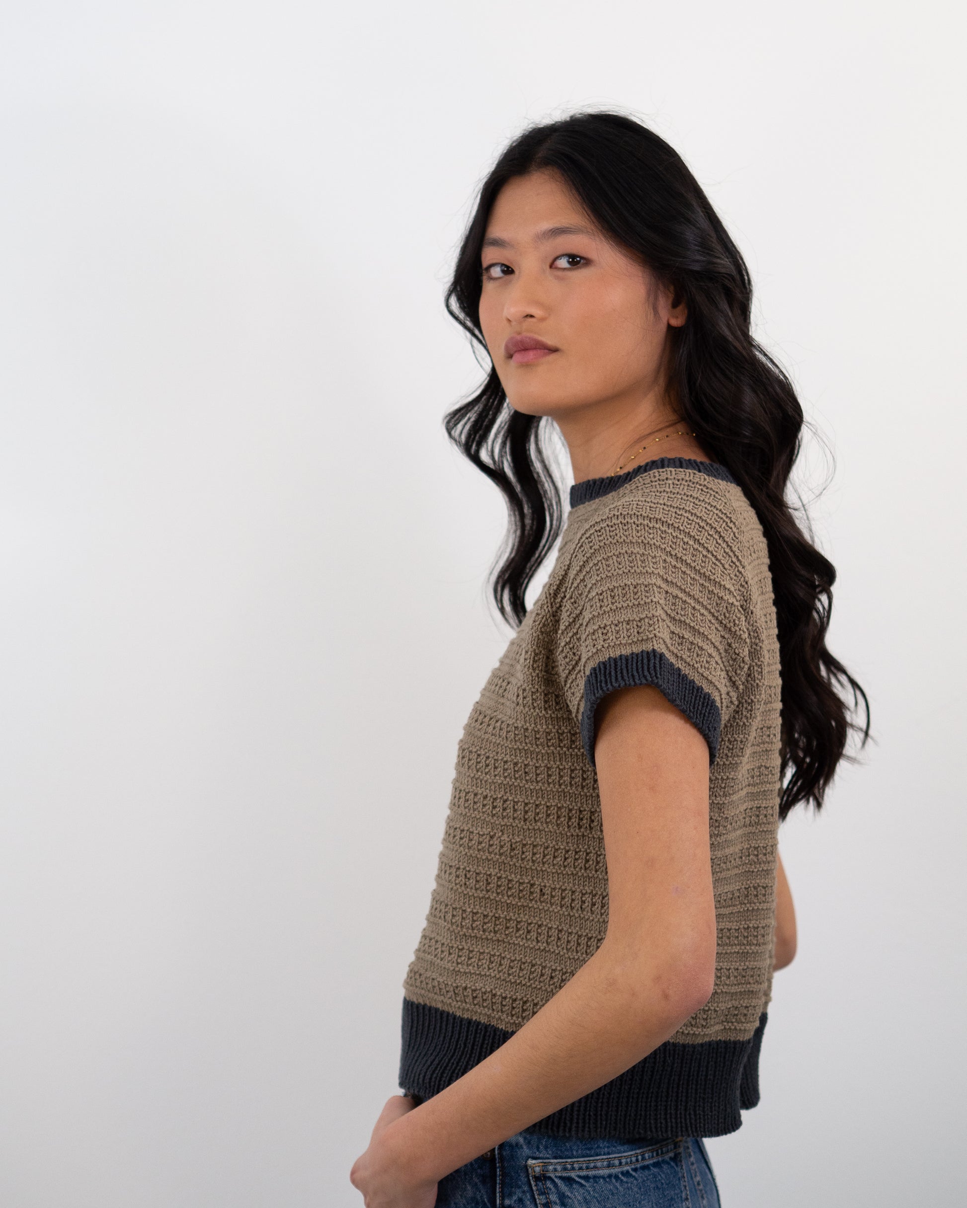 Agujas circulares de 3’5 mm [US 4] con cables de 40 cm [16"] para el escote y 80 cm [32"] para el cuerpo, o las necesarias para obtener la muestra de tensión.