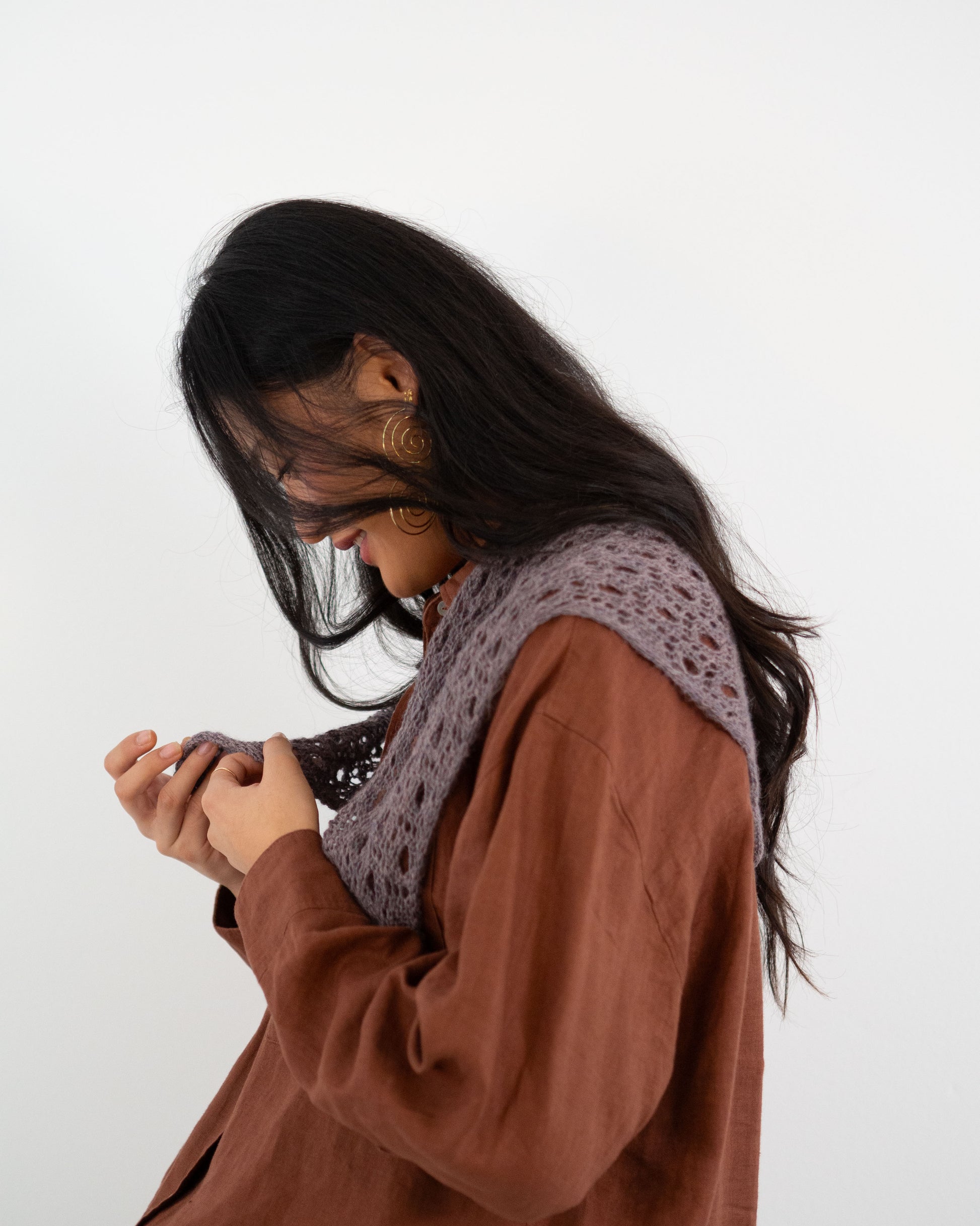 Dubra es una pañoleta pequeña, perfecta para llevar en el bolso y abrigar tu cuello en cualquier momento, sencilla de llevar puede elevar cualquier outfit con el simple gesto de llevarla puesta.