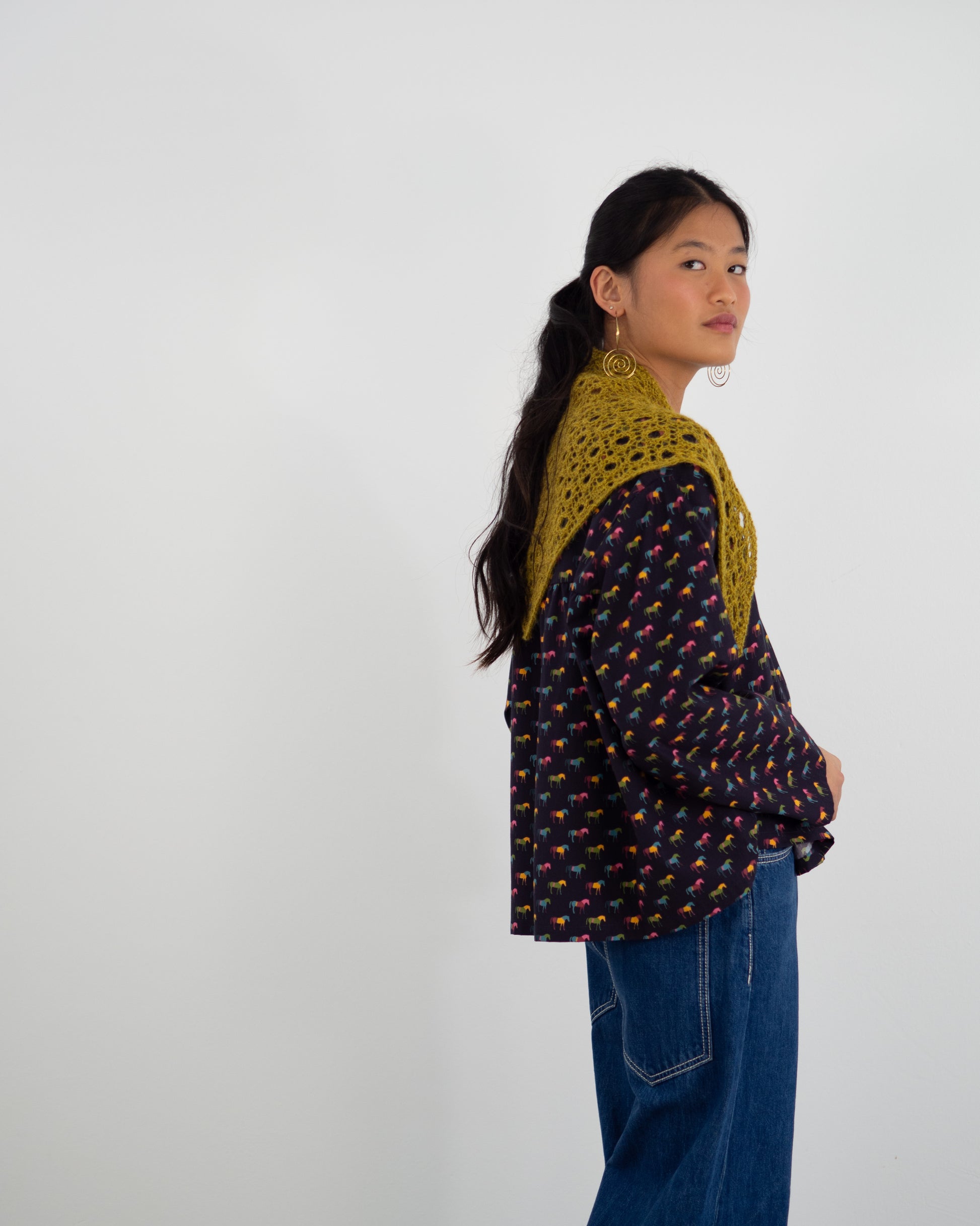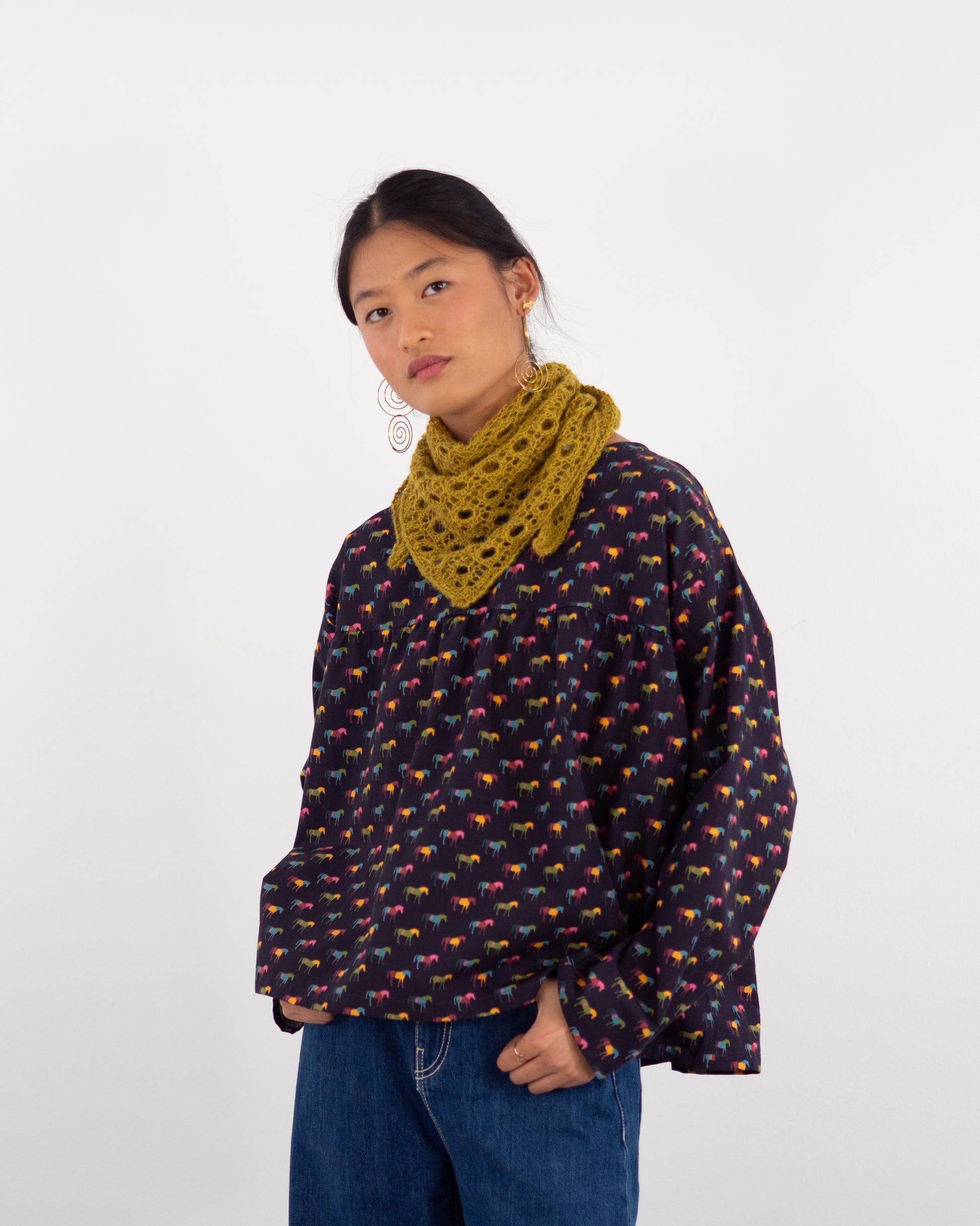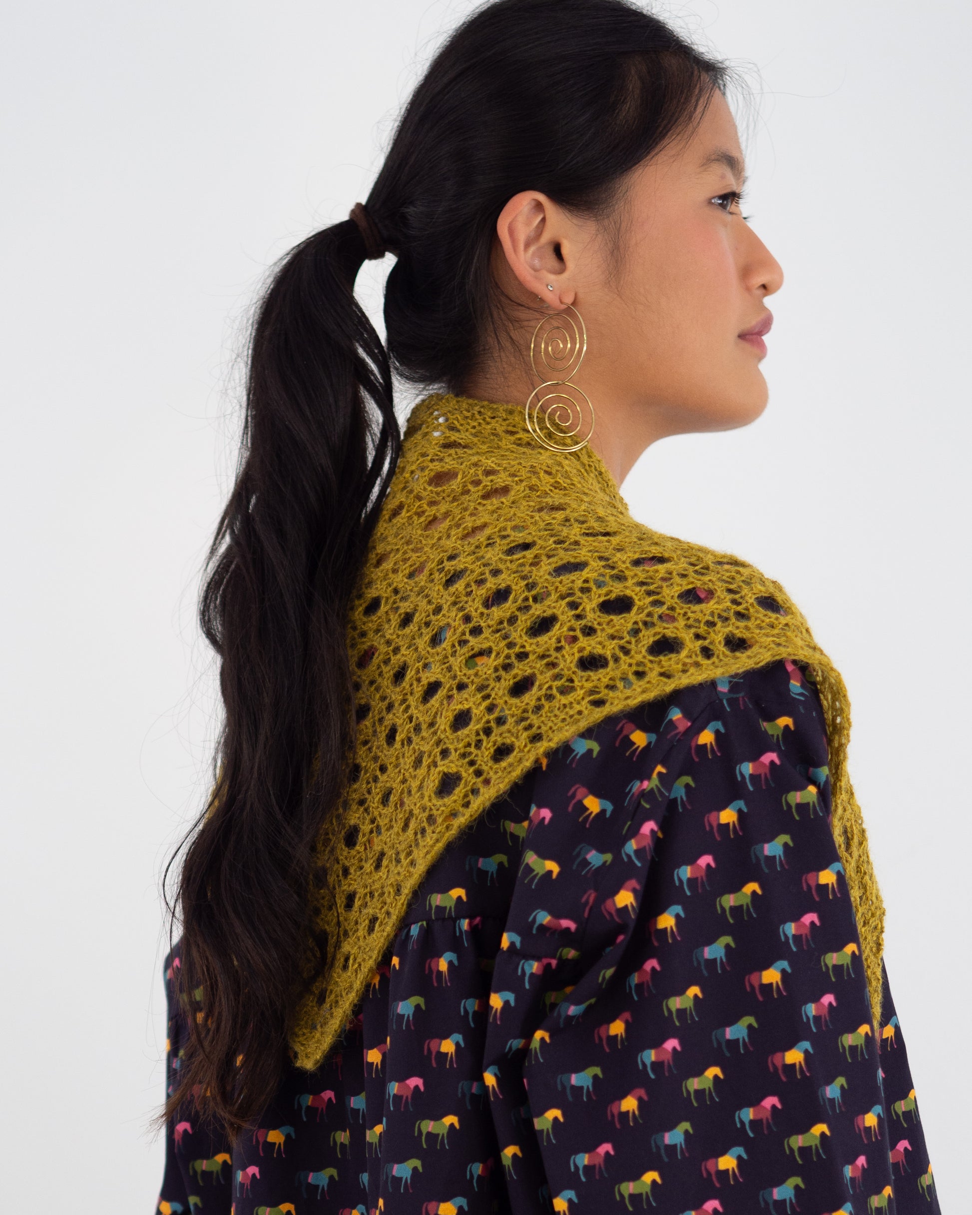 Esta pañoleta se teje de abajo a arriba, una vez alcanzado el tamaño deseado se cierran los puntos de la parte superior de la pañoleta perpendicularmente haciendo reducciones hasta que no quede ningún punto
